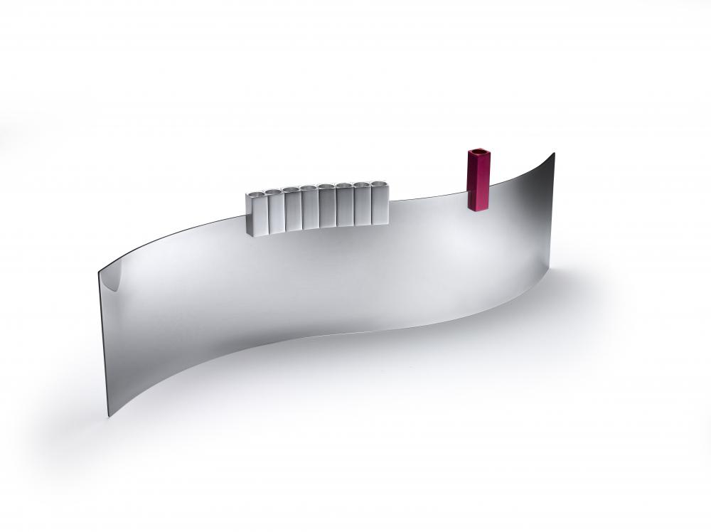 The steel base of this unique modern Hanukkah menorah is created out of gently formed highly polished steel. The gloss anodized aluminum candle holders can be slotted wherever you wish on the top of the steel base and are magnetized with neodymium magnets.