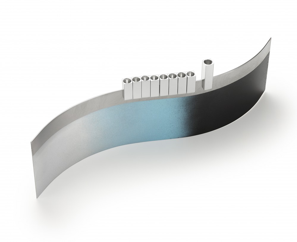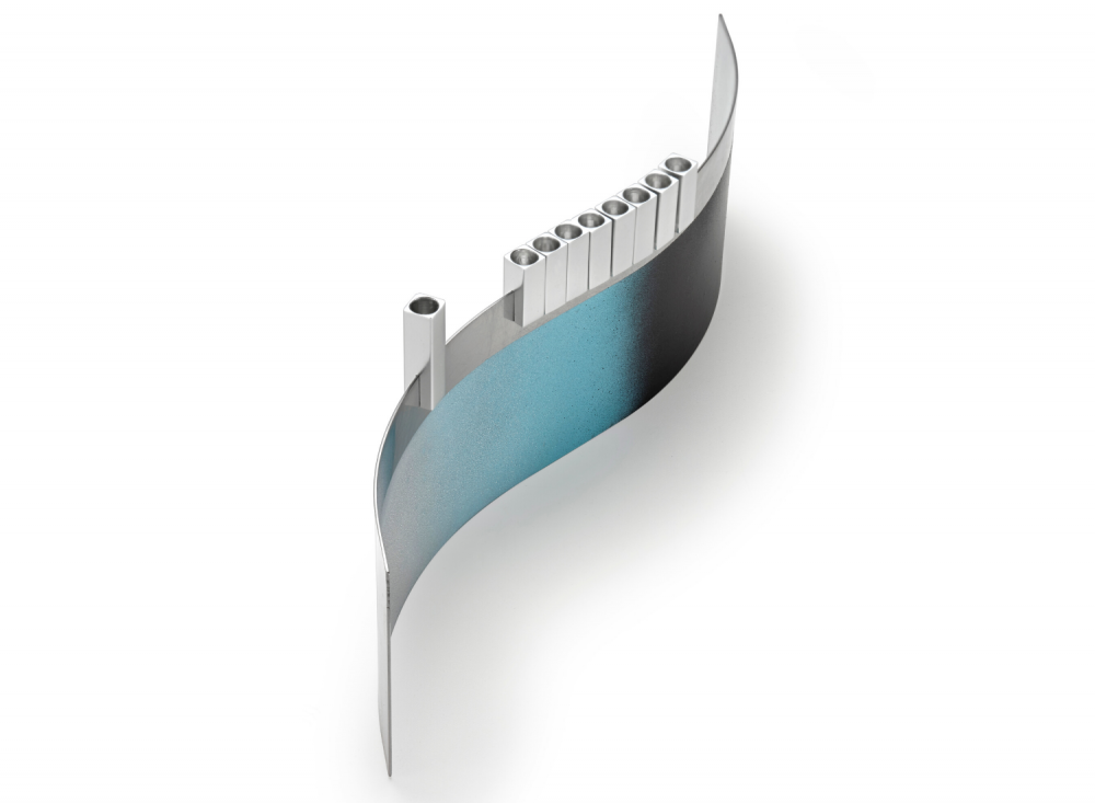 The steel base of this contemporary menorah is created out of gently formed highly polished steel and each one is hand painted by Laura. The gloss anodized aluminum candle holders can be slotted wherever you wish on the top of the steel base and are magnetized with neodyium magnets.