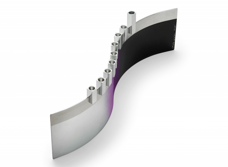 The steel base of this contemporary menorah is created out of gently formed highly polished steel and each one is hand painted by Laura. The gloss anodized aluminum candle holders can be slotted wherever you wish on the top of the steel base and are magnetized with neodyium magnets.