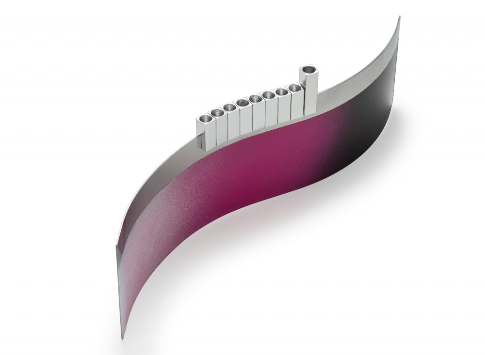 The steel base of this contemporary menorah is created out of gently formed highly polished steel and each one is hand painted by Laura. The gloss anodized aluminum candle holders can be slotted wherever you wish on the top of the steel base and are magnetized with neodyium magnets.