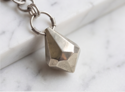 The centerpiece is a hand-finished, faceted pendant with a distressed silver electroplated finish, inspired by raw city textures and traditional chainmaille.Made to order, no two necklaces are identical
