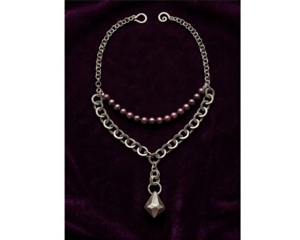 Handcrafted in my studio, this double-stranded statement piece explores the contrast between timeless elegance and urban edge. A row of deep purple-black pearls sits alongside a bold, industrial-inspired chain, creating a layered look that feels both feminine and strong.